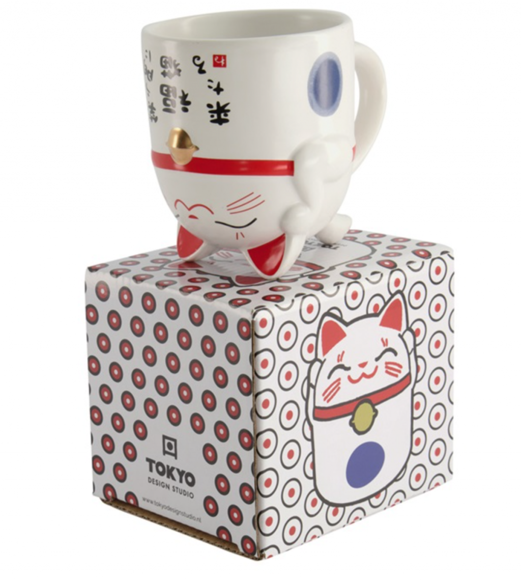 Oryginalny japoński kubek do herbaty w kolorze białym z motywem Kotka Maneki neko, który staje na własnych uszkach.