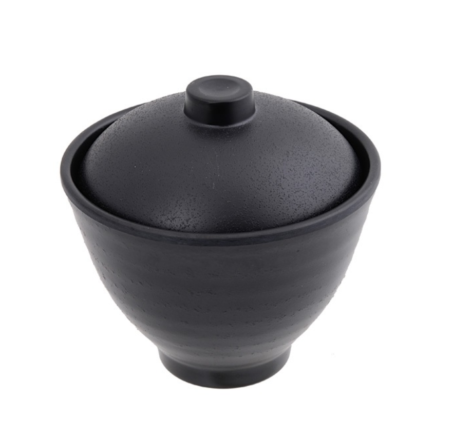 Tradycyjna miska czarna z pokrywką, z melaminy ( materiał imitujący lakę ) do serwowania zup typu miso, tajskich lub ryżu. poj. 250 ml wymiary :10 x 8 cm Made in Japan